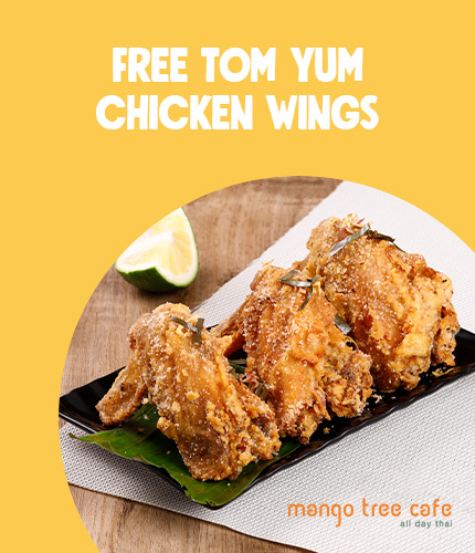 Get FREE Tom Yum Chicken Wings with a minimum P3,000 spend at select branches of Mango Tree Cafe.