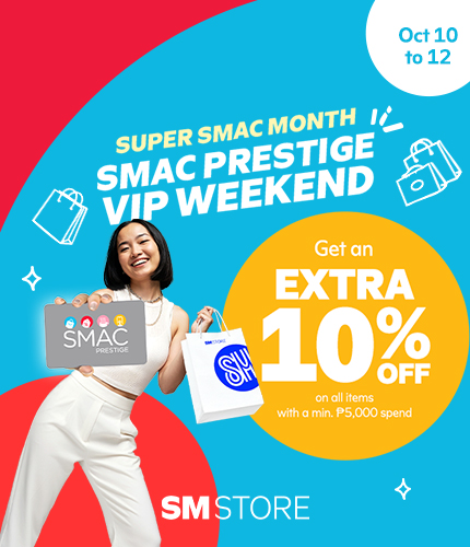 - SMAC Prestige members with a minimum single-receipt purchase of ₱5,000 will get 10% OFF on all items from October 10-12, 2025, in all SM Store branches nationwide.