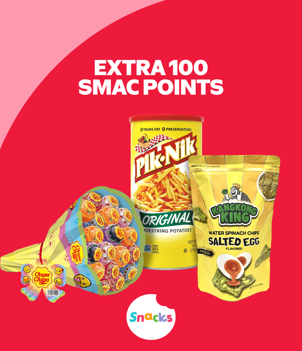 Earn EXTRA 100 SMAC Points with a minimum P1,000 single-receipt spend on select items at Snacks.